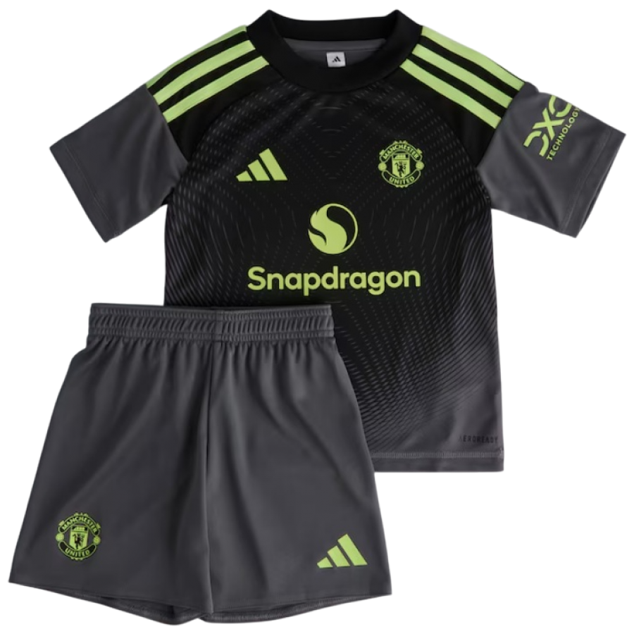 Por 129,90 o novo Kit infantil Goleiro II Manchester United 2025 2026 Adidas oficial éum conjunto reserva preto o u..